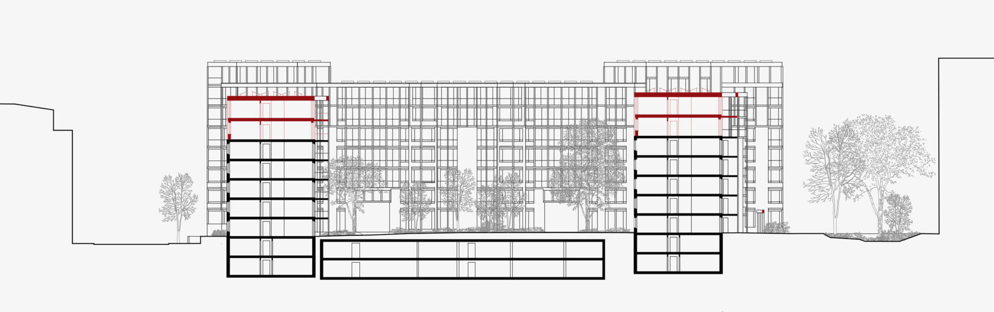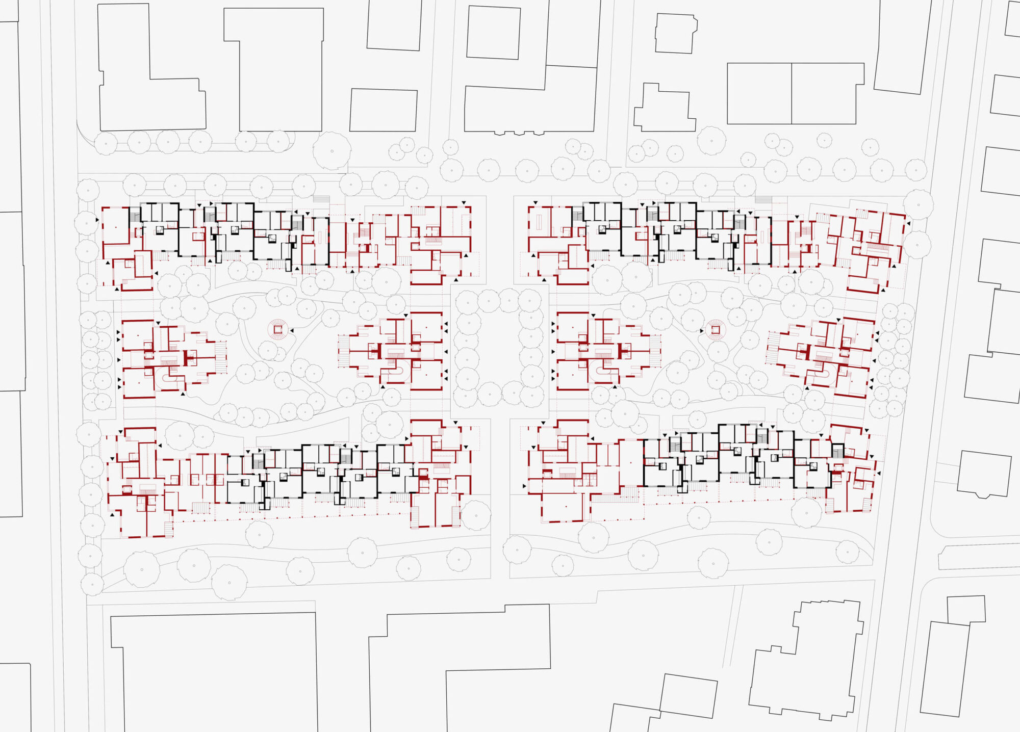 Stehen lassen, was sich integrieren lässt: Die Nachhaltigkeitsdiskussion gebietet, nicht nur das Erhaltenswerte zu erhalten, sondern das Erhaltbare. Weil die Häuser vor Ort dies durchaus sind, werden sie in die viel dichtere neue Konzeption des Areals integriert. Dass nicht mehr als knapp die Hälfte des Bestands erhalten werden kann, liegt daran, dass die heutigen Gebäude zu sperrig auf dem Grundstück stehen: Die Abstände zueinander sind zu eng, um neben oder zwischen sie Neubauten zu stellen, die Abstände zu den Strassen dagegen zu weit, um Strassenraum und Erdgeschosse mit städtischem Leben zu füllen.