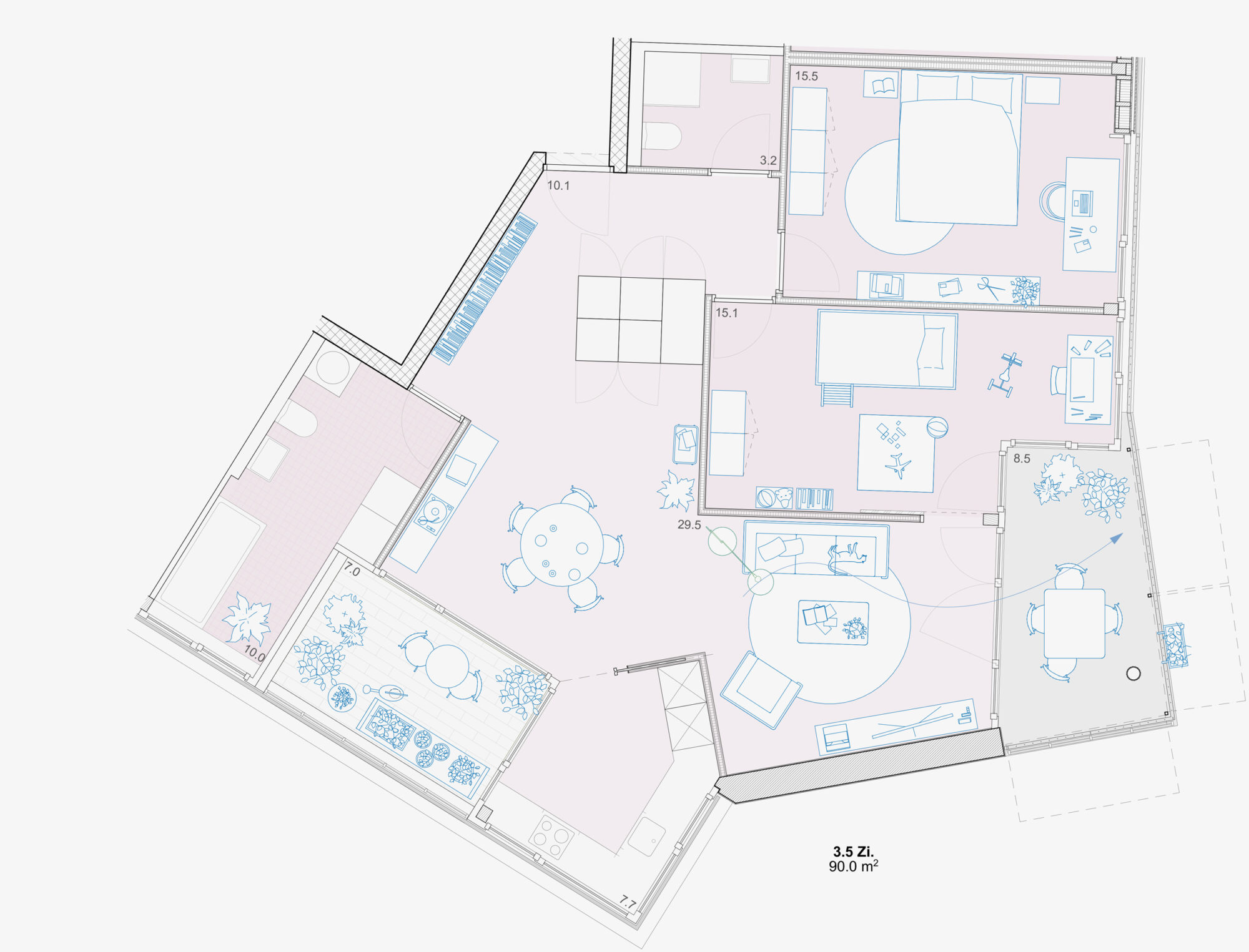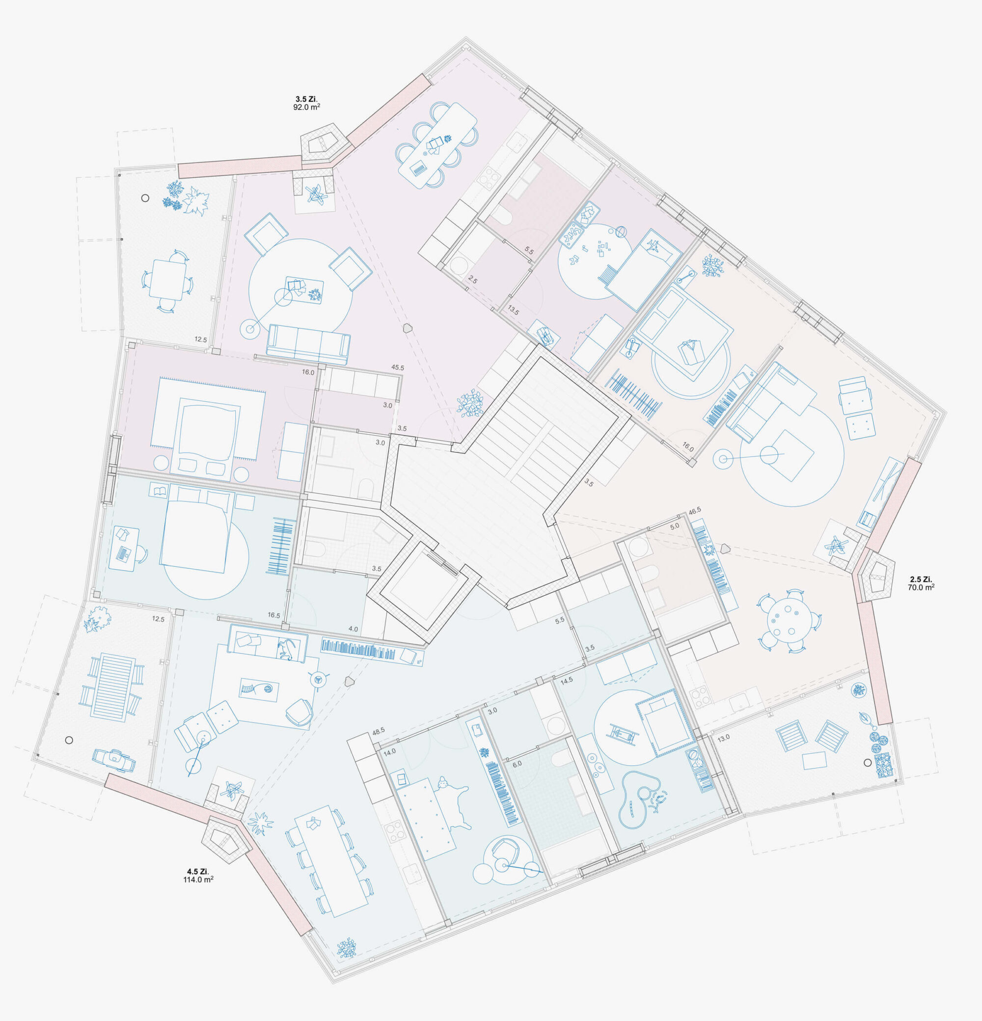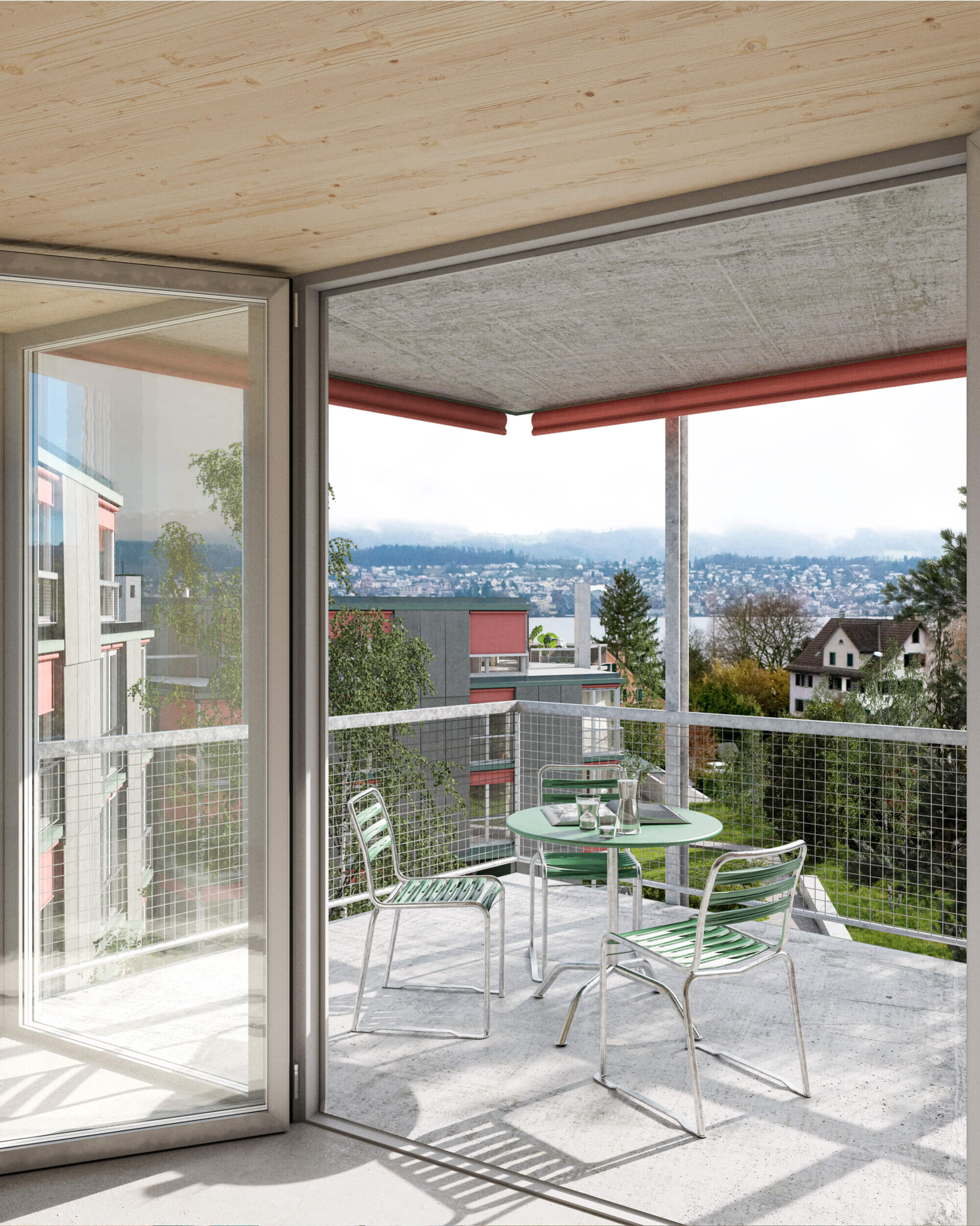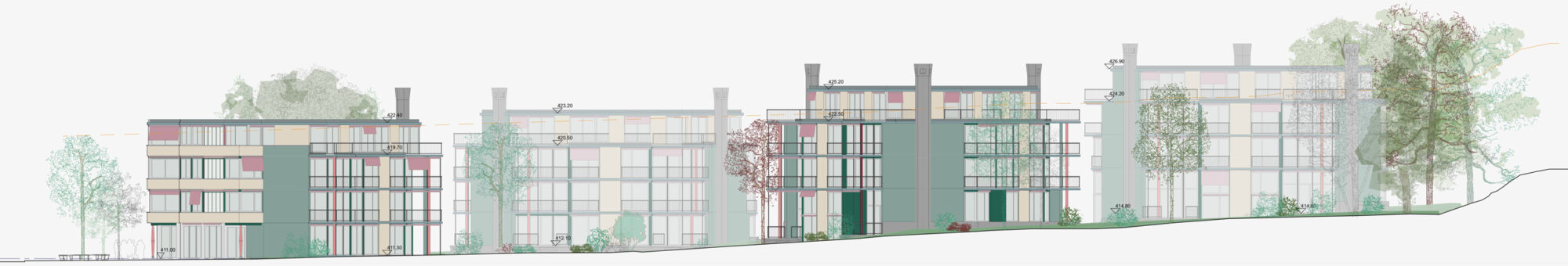 Die Bebauung wird in Analogie zu einer Perlenkette konzipiert – ein gebauter Grat, von welchem aus beidseitig auf den See geblickt werden kann. In einer Schlangenlinie verläuft der Grat über das Grundstück, vergrössert dadurch die Abwicklung und maximiert die Möglichkeit der Sicht auf den See. Den Fassaden folgend entstehen Aussenräume, sowohl Garten- als auch Zugangsräume. Auch aus den hinteren Wohnungen sieht man aufgrund der Schlangenlinie an den davorliegenden Häusern vorbei zum See.