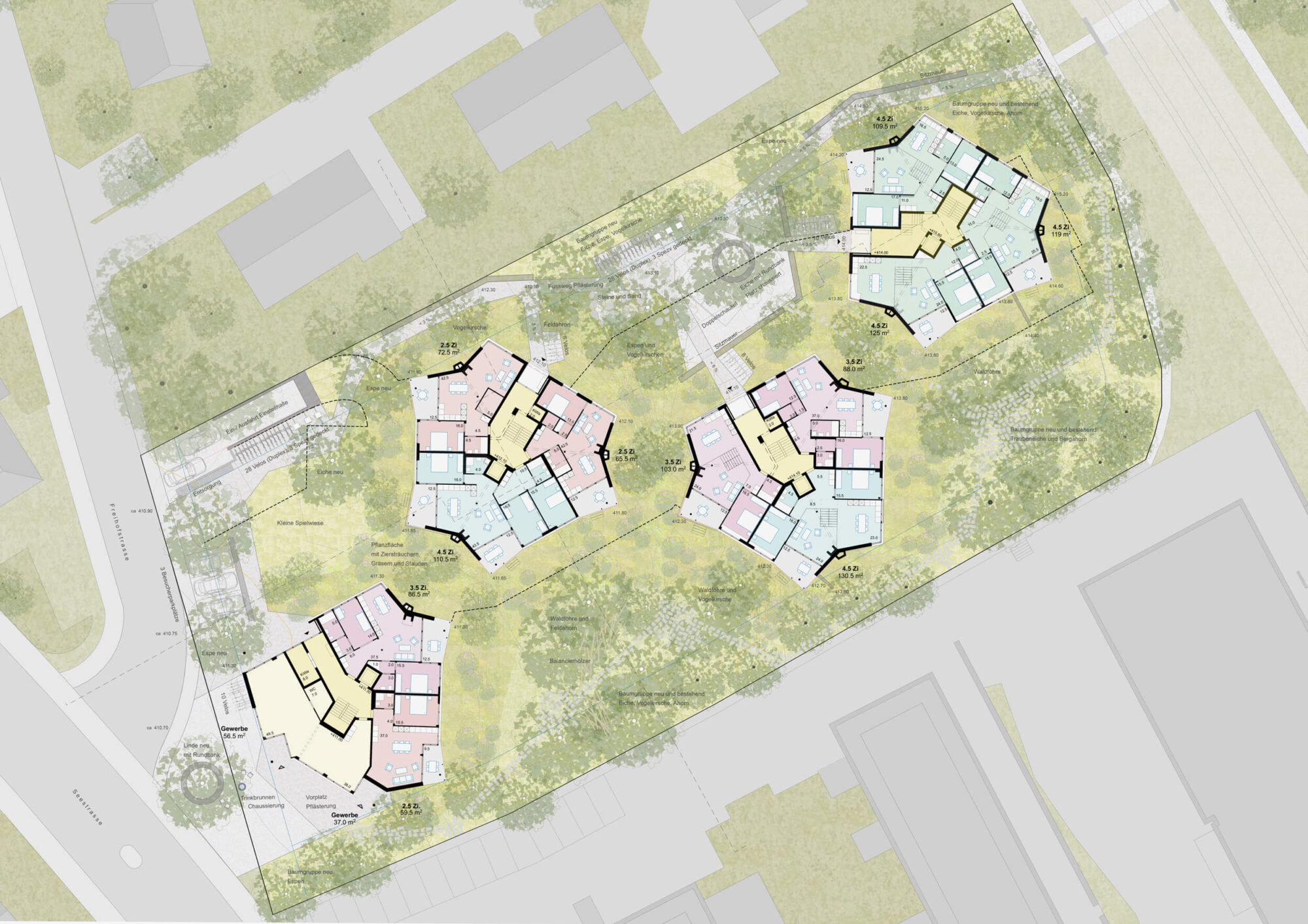 Die Häuser sind umspült vom üppigen Garten. In diesem greifen öffentlichere Zugangsbereiche und abschirmende privatere Bereiche ineinander wie Yin und Yang. Nordwestseitig führt der Zugangsweg über den öffentlicheren Aussenraum von der Freihofstrasse zu den Eingängen der Häuser und weiter zur Unterführung der Bahn auf dem Weg nach Erlenbach. Niedere Sitzmauern aus Stampflehm begleiten die gepflasterten Erschliessungswege und bieten den Bewohnenden der Siedlung verschiedene Aufenthaltsmöglichkeiten. Hier begegnet man sich und lernt sich kennen. Eine Wiese mit Spielgeräten begleitet den Zugangsweg zu den Gebäuden.