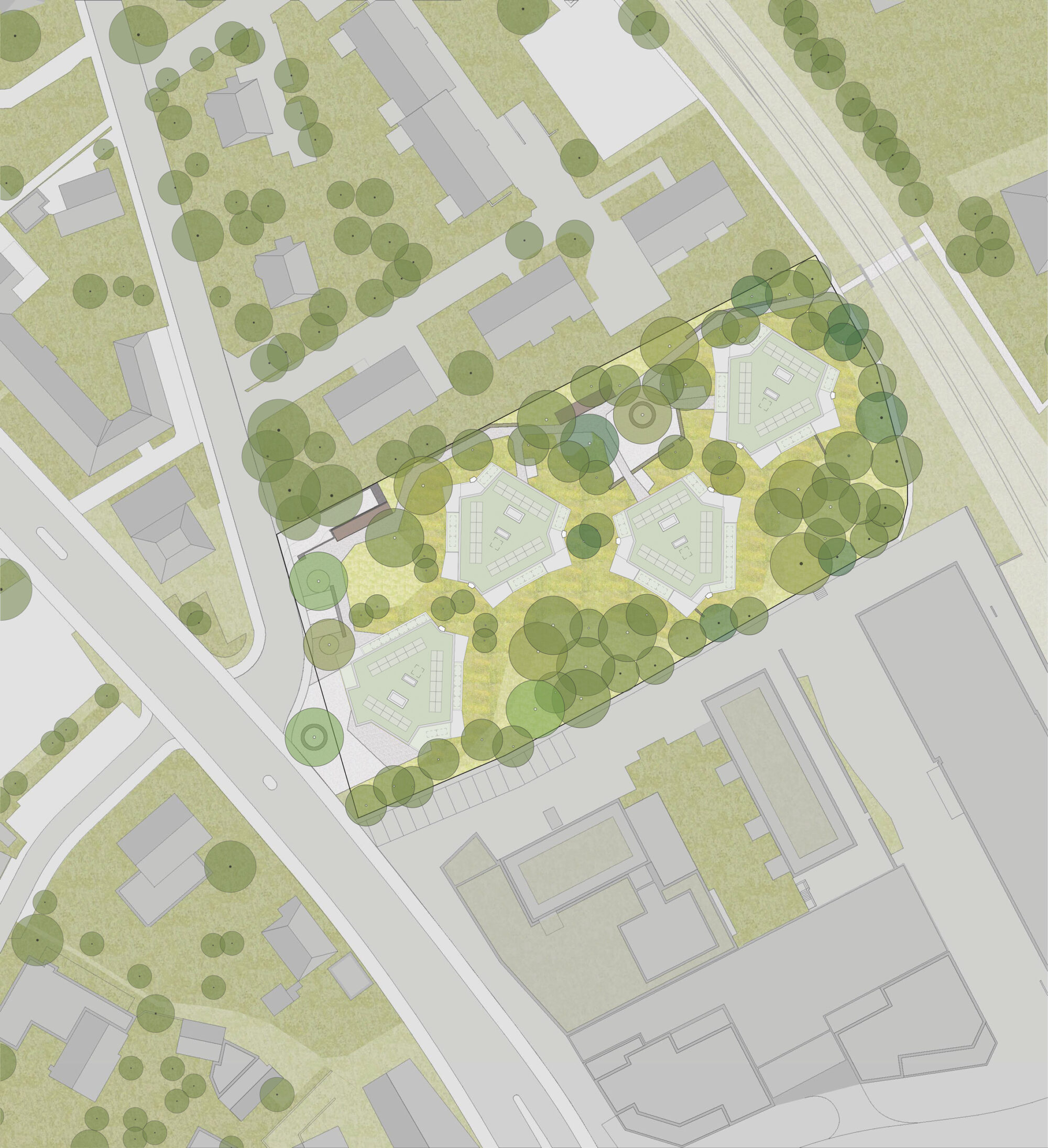 In Küsnacht, entlang dem See, stehen die Villen in Gärten, gefasst von Bäumen, die den Strassenraum bilden. Dieses Muster nehmen wir auf. Bäume säumen die Ränder des Grundstücks und bilden so einen Vordergrund, der sich dort lichtet, wo der Blick auf den See frei wird.