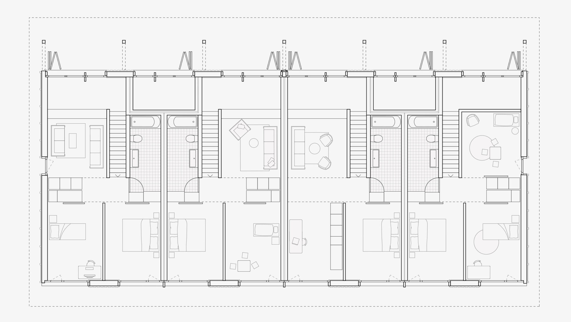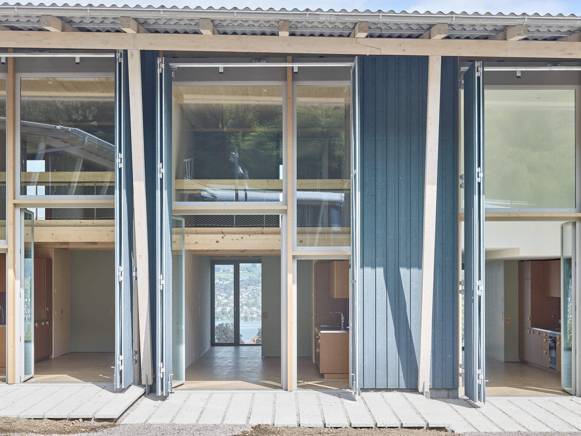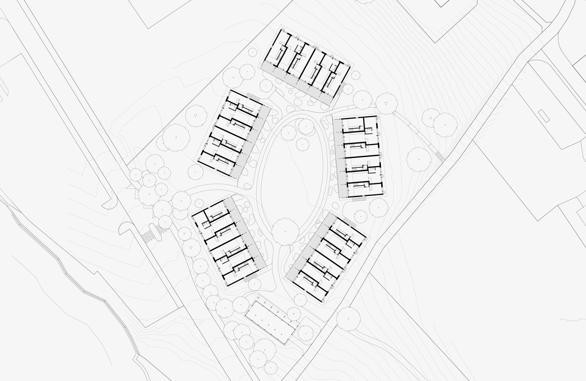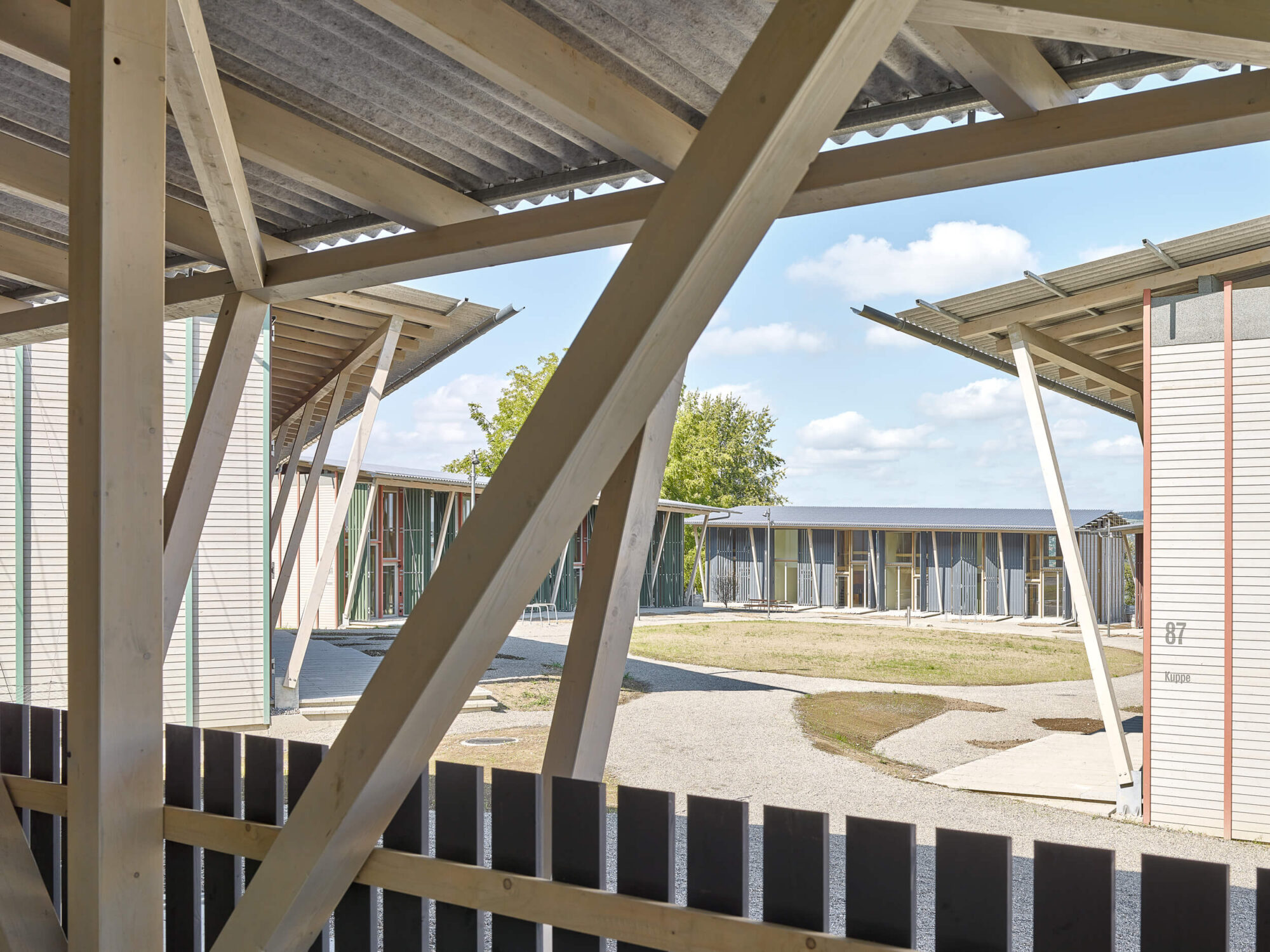 Die Baukörper vereinigen unter ihren weit ausladenden Dächern eine bunte Mischung von Wohnungen. Diese sind komplementär ineinander gefügt und thematisieren so räumlich das Zusammenleben unterschiedlicher Lebensformen.