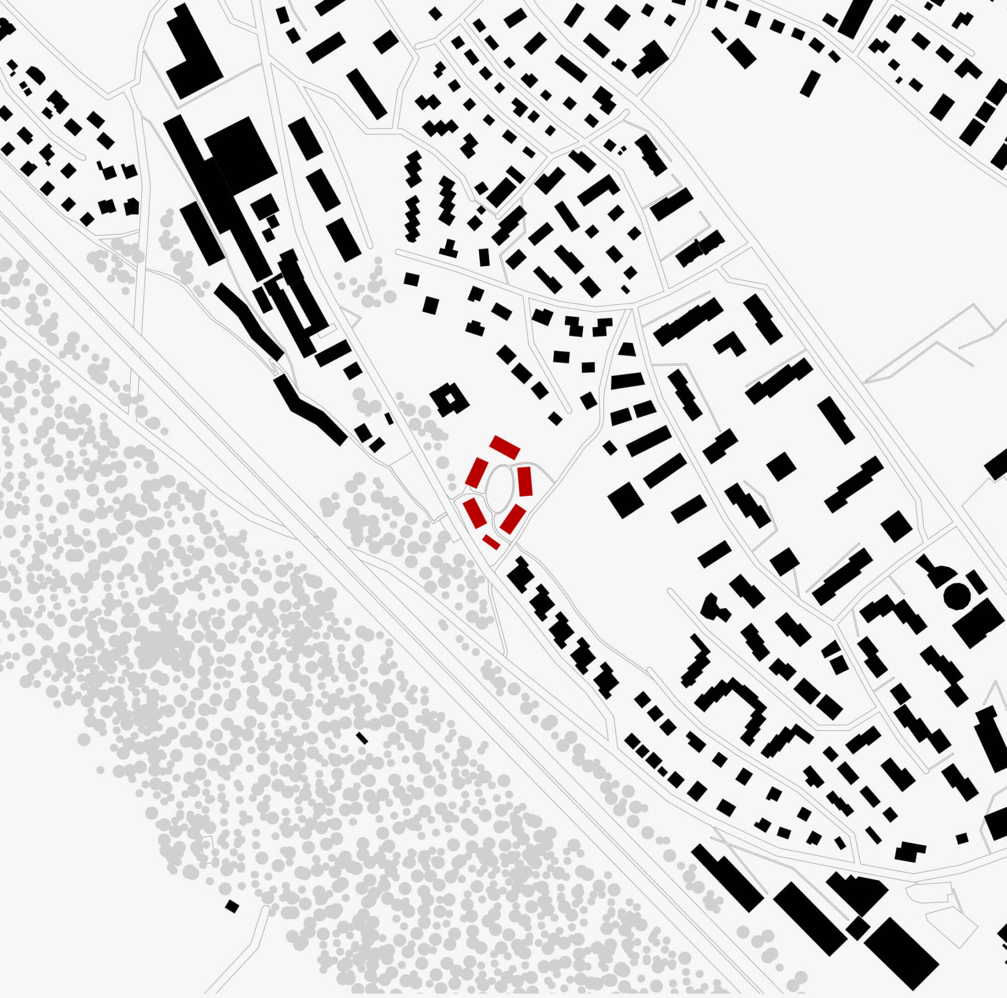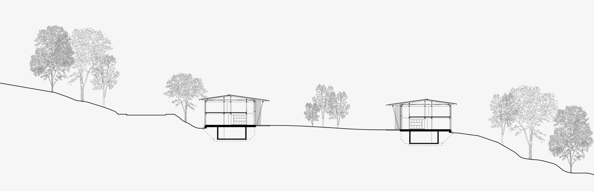 Damit diese Kuppe freibleiben kann, stehen die Häuser an ihren Rändern. Die 5 Wohnhäuser und das Velohaus sind zerbrechliche, dünnwandige Häuser aus Holz, die hier gleichsam provisorisch aufgestellt worden sind. Vielleicht erinnern sie auch an Zirkuswagen, die zu einer Wagenburg gruppiert sind, und die Zugangswege sind die Reifenspuren der Traktoren. Es erweist sich als gar nicht so einfach, unberührtes, freies Land zu bebauen – daher wohl die Vorsicht dieser Landnahme auf Zeit.