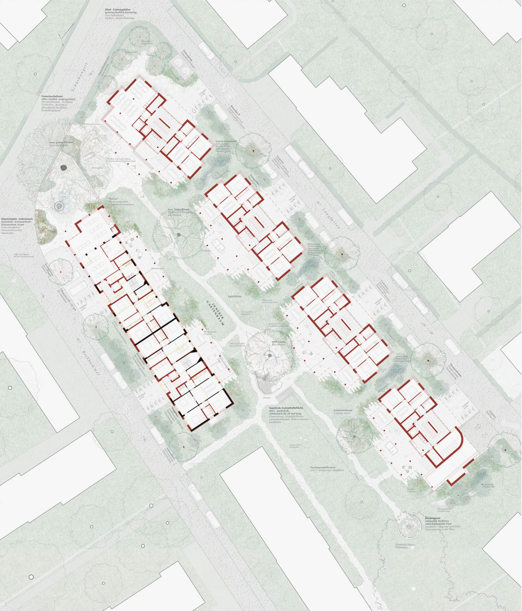 . Das Erdgeschoss aufständern. Auf der Hofseite stehen die Gebäude auf Stützen. Der weitläufige Raum darunter entschädigt grosszügig für die Dichte der Gebäude darüber. In diesem Möglichkeitsraum werden Tischtennis gespielt, Wäsche getrocknet, Velos repariert und Grillabende veranstaltet. Nimmt man den gedeckten Freiraum unter den Gebäuden dazu, so bleibt der Hofraum im Erdgeschoss ebenso breit wie heute.