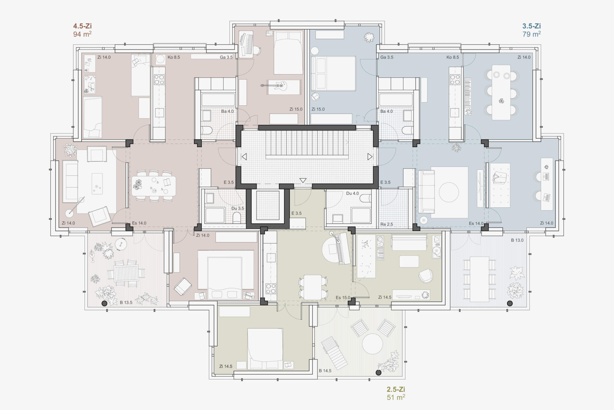 . Die Gartenstadt von morgen wird vertikal: Grosse Loggien, Balkone oder Veranden eröffnen einen innigen Bezug zum Freiraum für die Wohnungen in den oberen Stockwerken. Der Freiraumbezug ist nicht länger den Erdgeschosswohnungen vorbehalten.