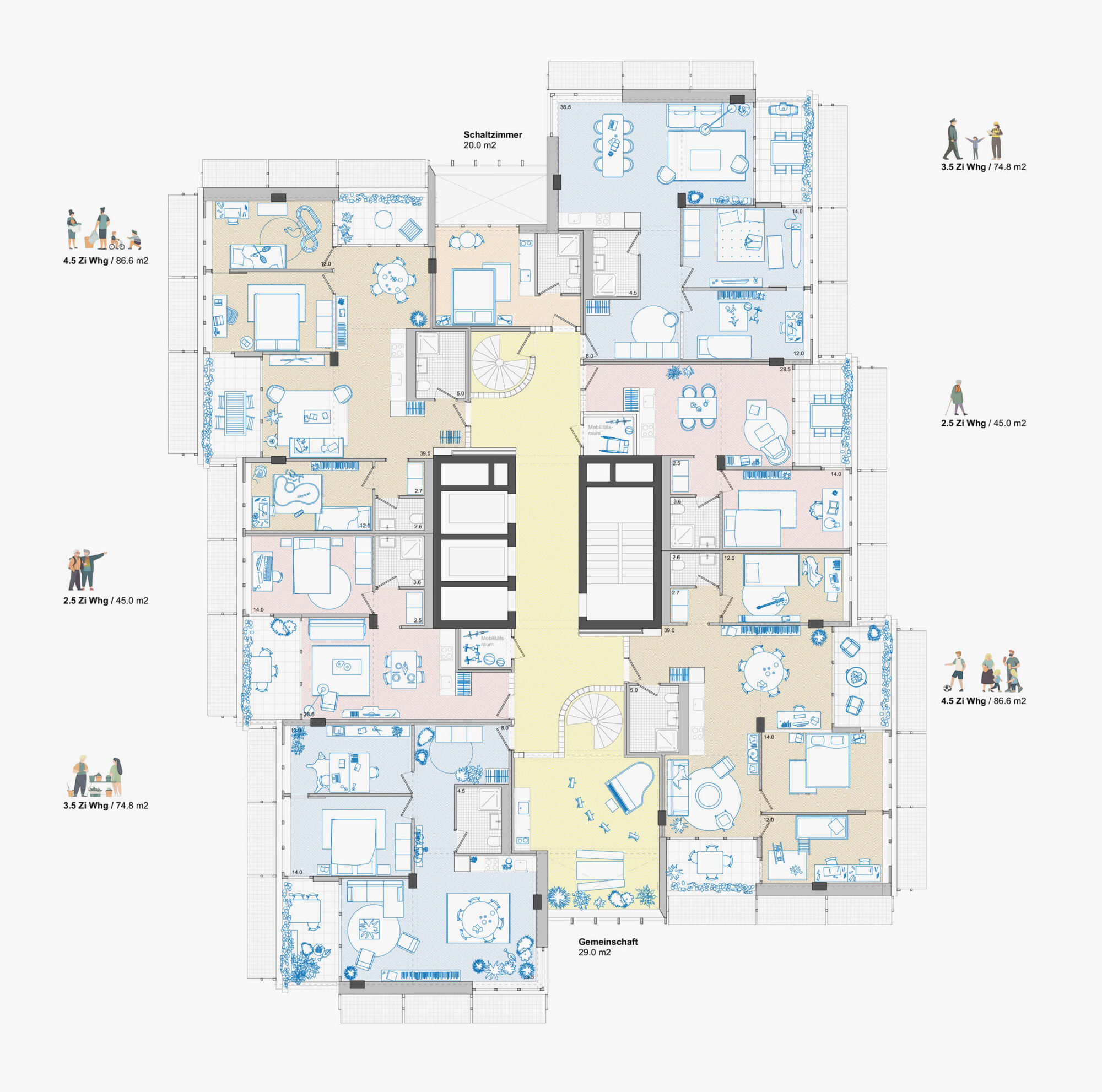 . Das gemeinschaftliche Leben im Haus findet in der von Norden nach Süden verlaufenden Fuge statt, welche zwischen den nach Osten und Westen ausgerichteten Wohnungen liegt. Dort finden die Bewohnenden transparente, aus dem Erschliessungskern einzusehende Gemeinschaftsräume für stille oder lautere Aktivitäten. Jeweils drei Geschosse bilden eine überschaubare Hausgemeinschaft und sind über eine ergänzende Wendeltreppe im Gemeinschaftsbereich vertikal verbunden.