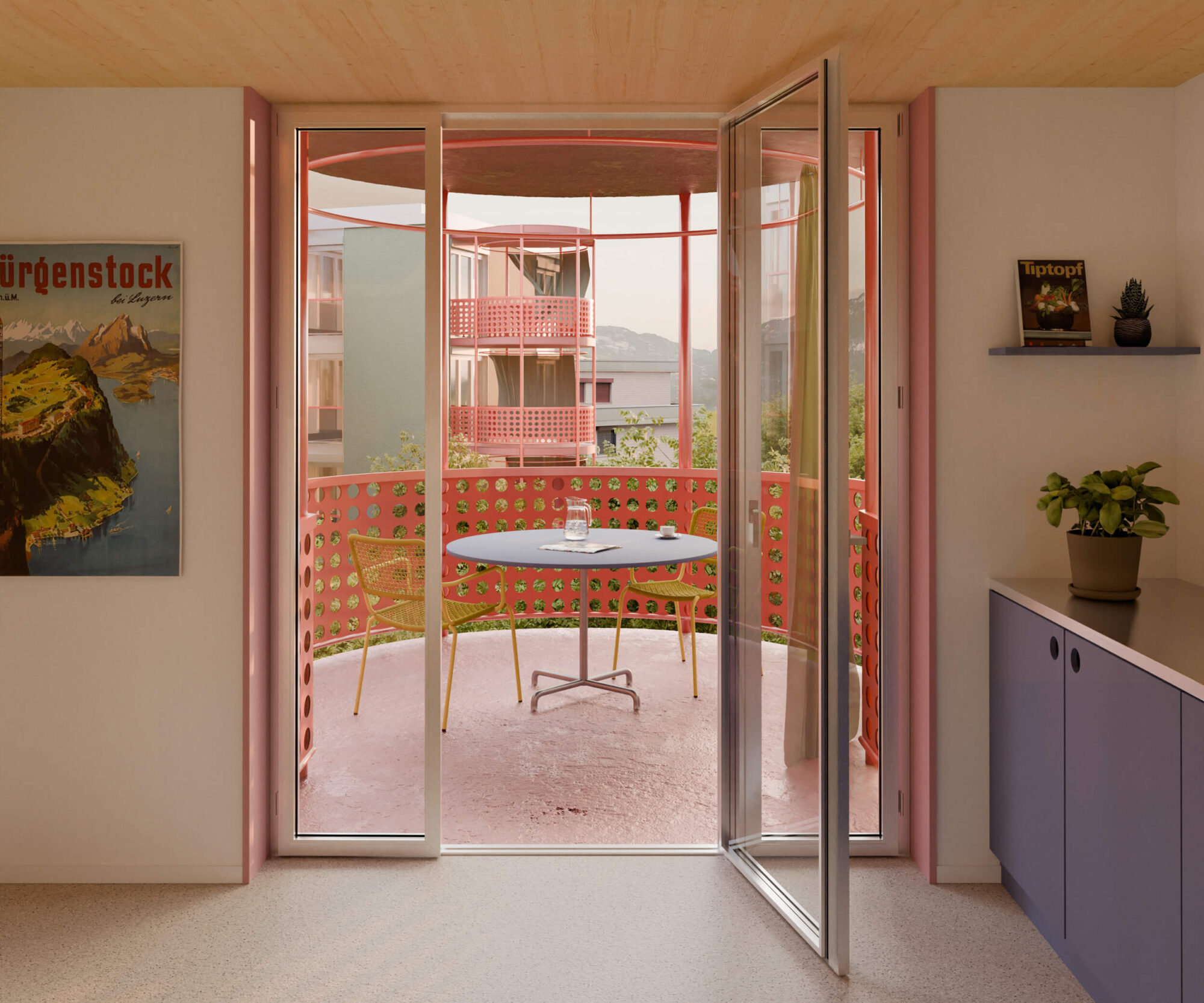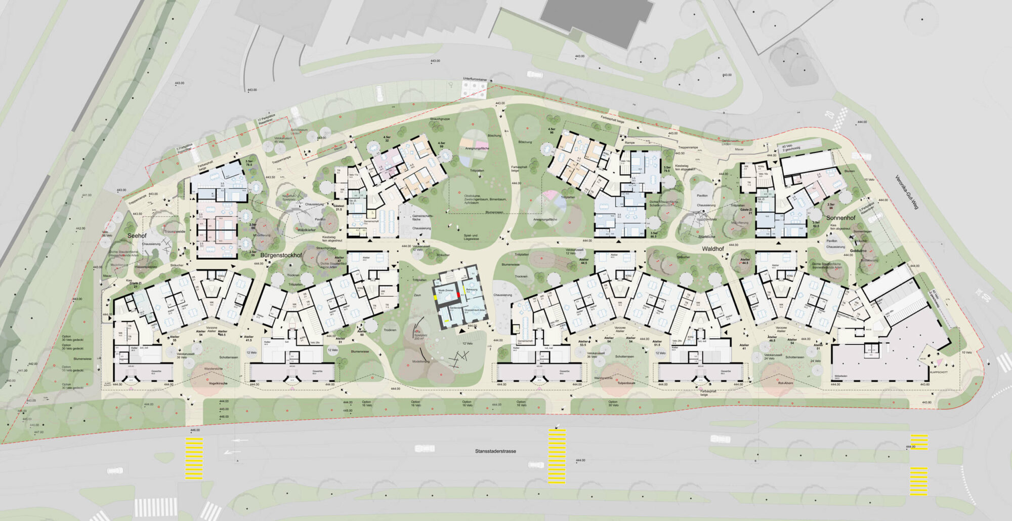 Stans besteht vorwiegend aus offenen Bebauungen, wo Baukörper den Aussenraum formen. Mit der angestrebten Dichte kommt die offene Bebauung an ihre Grenzen, die Aussenräume bleiben als Resträume zwischen den verdrängenden Baukörpern zurück. Die Dichte erfordert eine alternative städtebauliche Strategie, wo Aussenräume die Baukörper formen. Die Dichte wird als siebengeschossige Masse über die gesamte Parzelle ausgebreitet. Daraus werden wohlproportionierte Aussenräume ausgeschnitten.