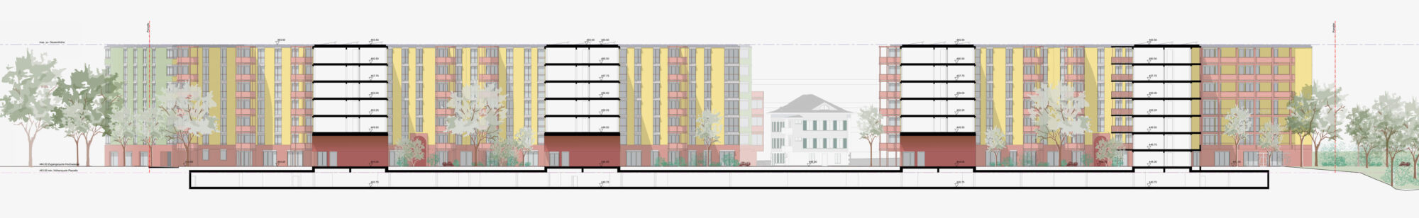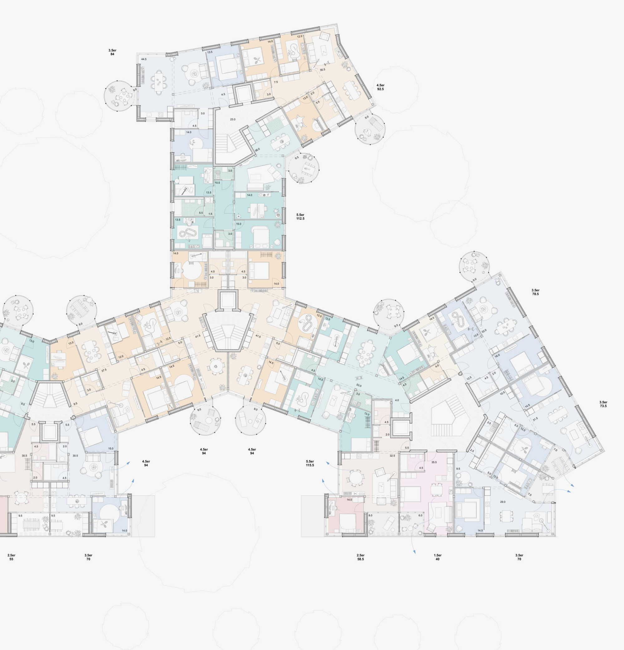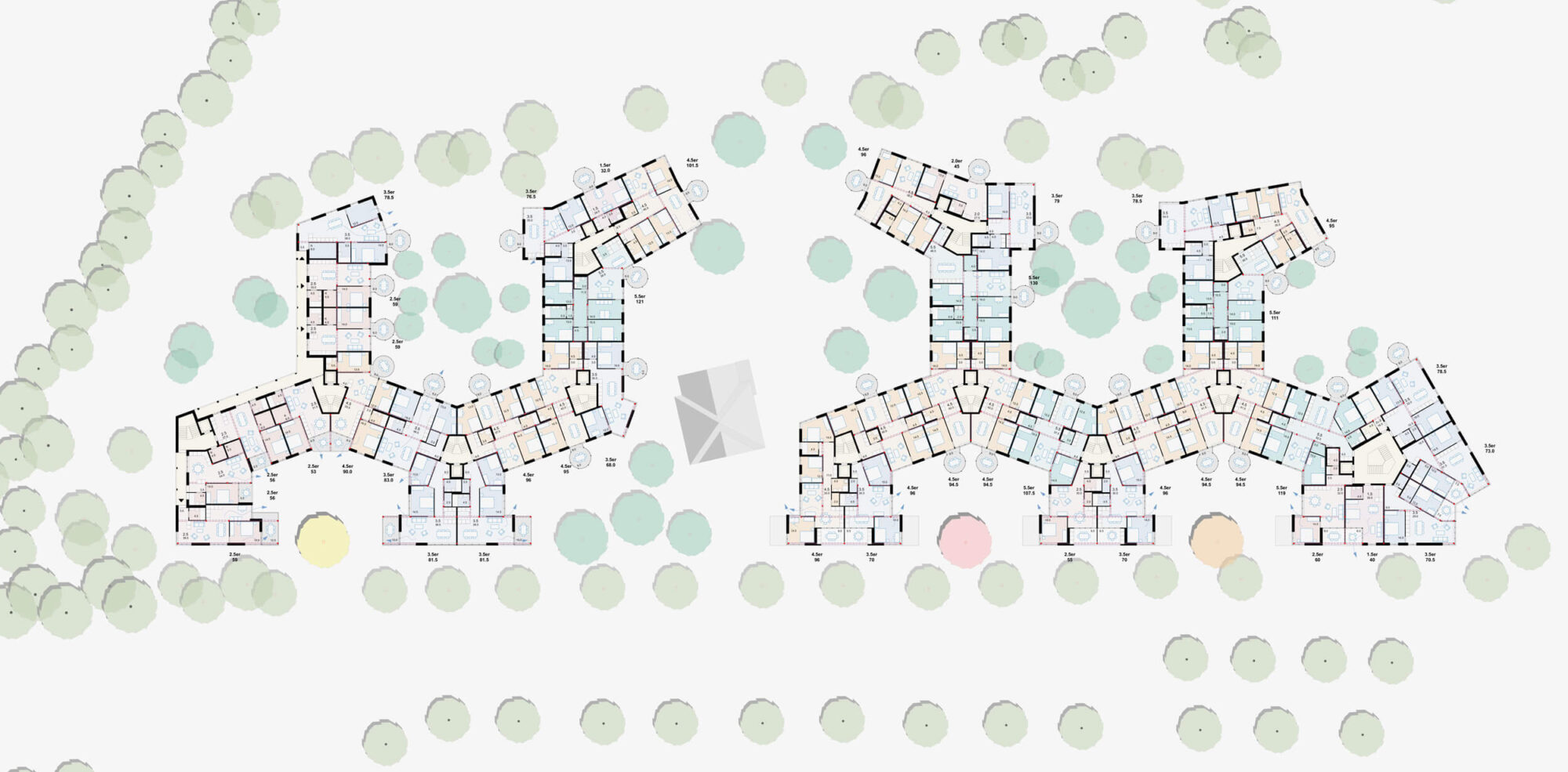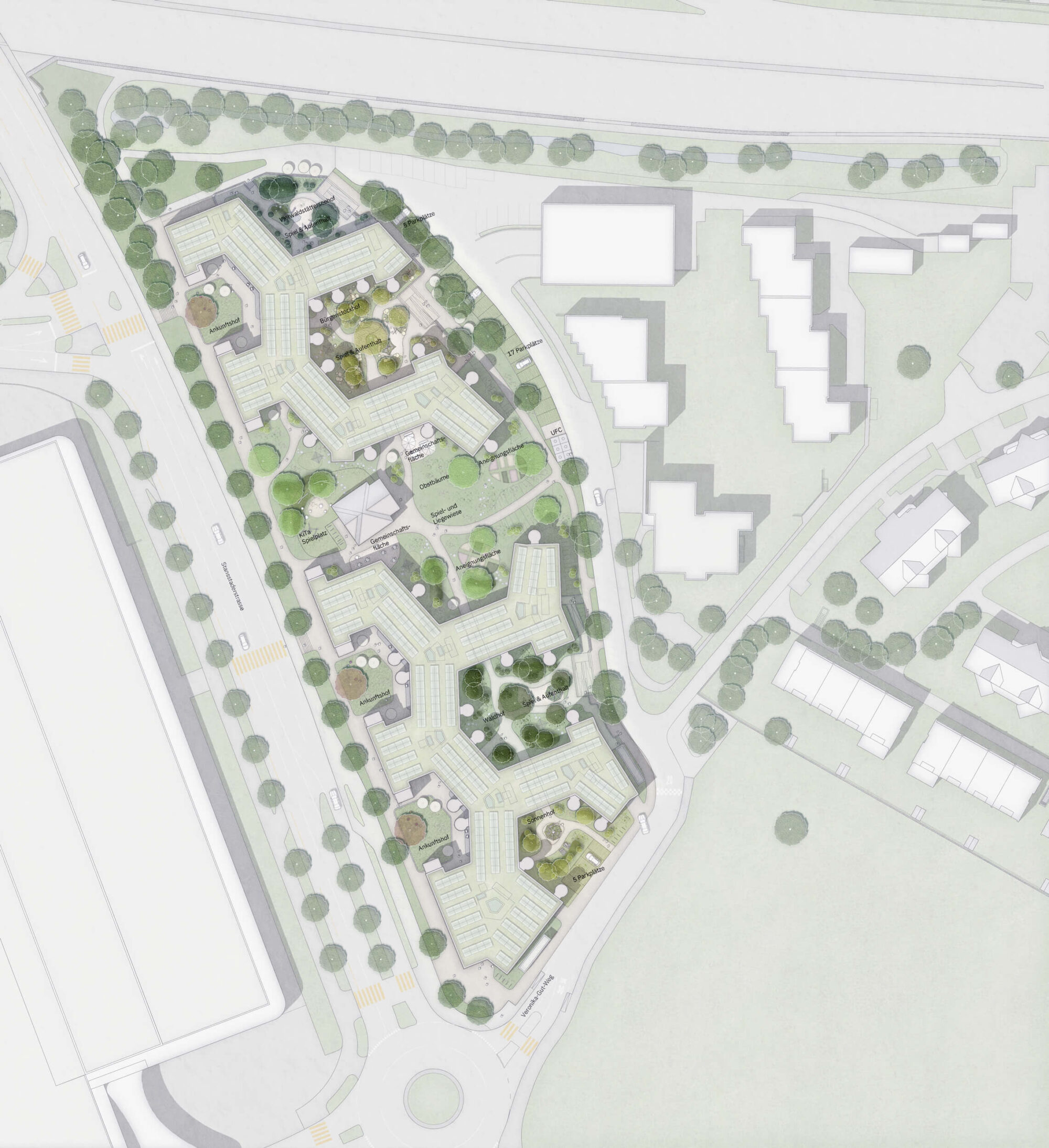 Die Dichte erschliesst sich erst auf den zweiten Blick. Entlang der Strassen als Punkthäuser wahrgenommen, verfügt die Bebauung mittig über einen verbindenden Grat. Der von Norden nach Süden verlaufende Grat ermöglicht eine Vielzahl von Wohnungen mit Ost-West-Orientierung.