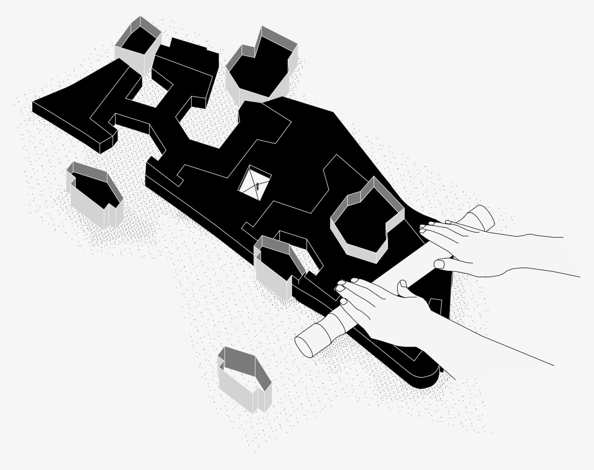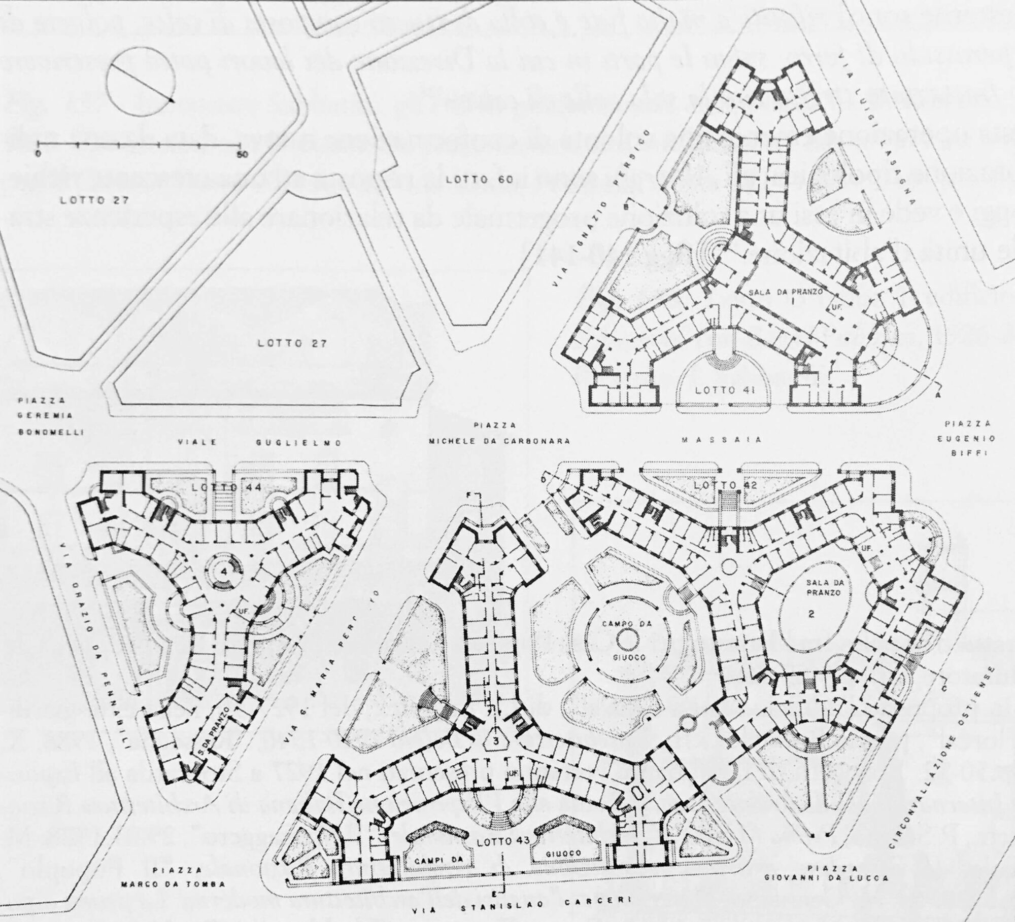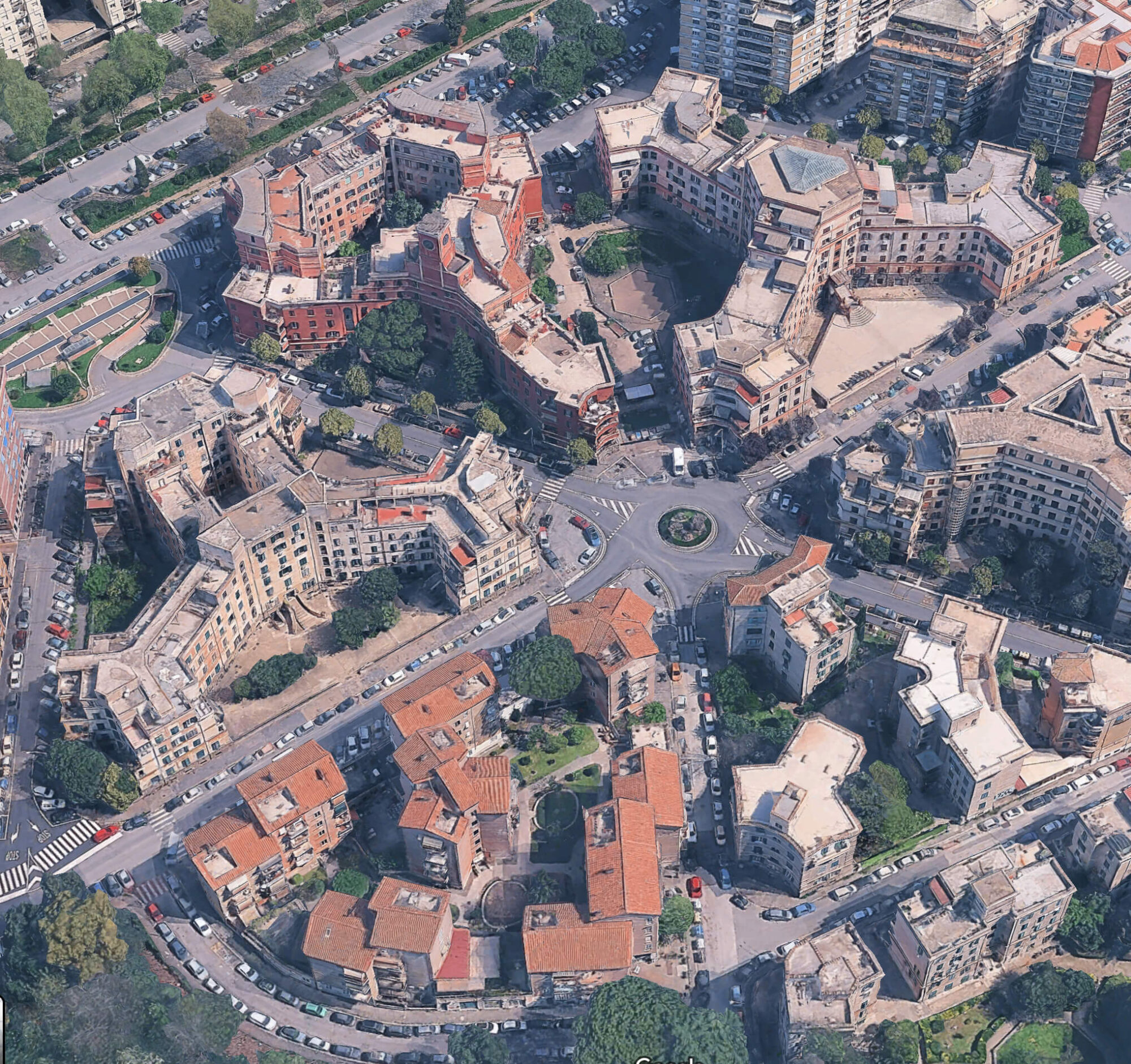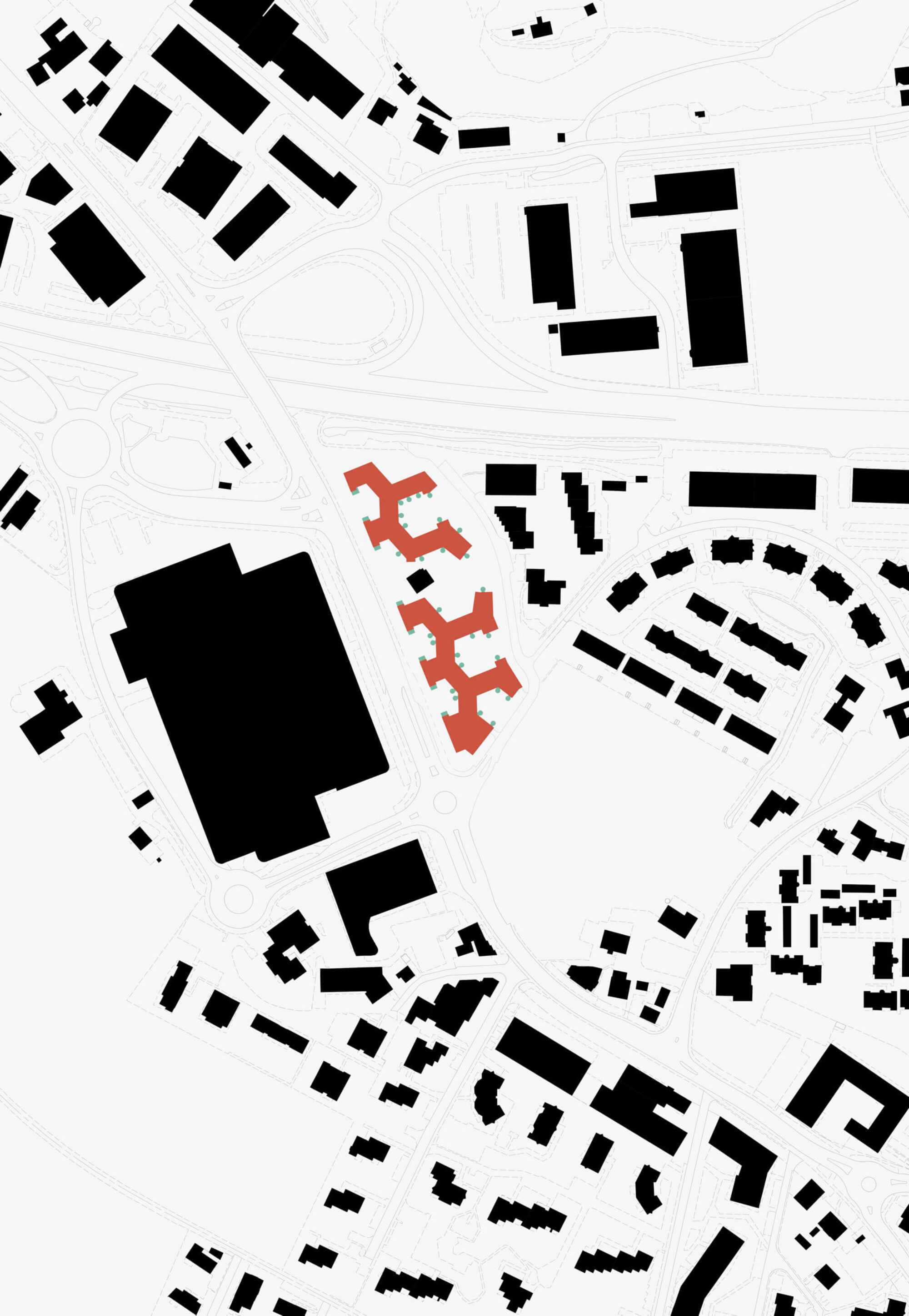 Ausgehend von einer überspannenden Grossform wird diese in Anlehnung an die Referenz Garbatella in Rom an die vorgefundenen Gegebenheiten angepasst, indem sie sich als freie Form zwischen die Strassenräume spannt.