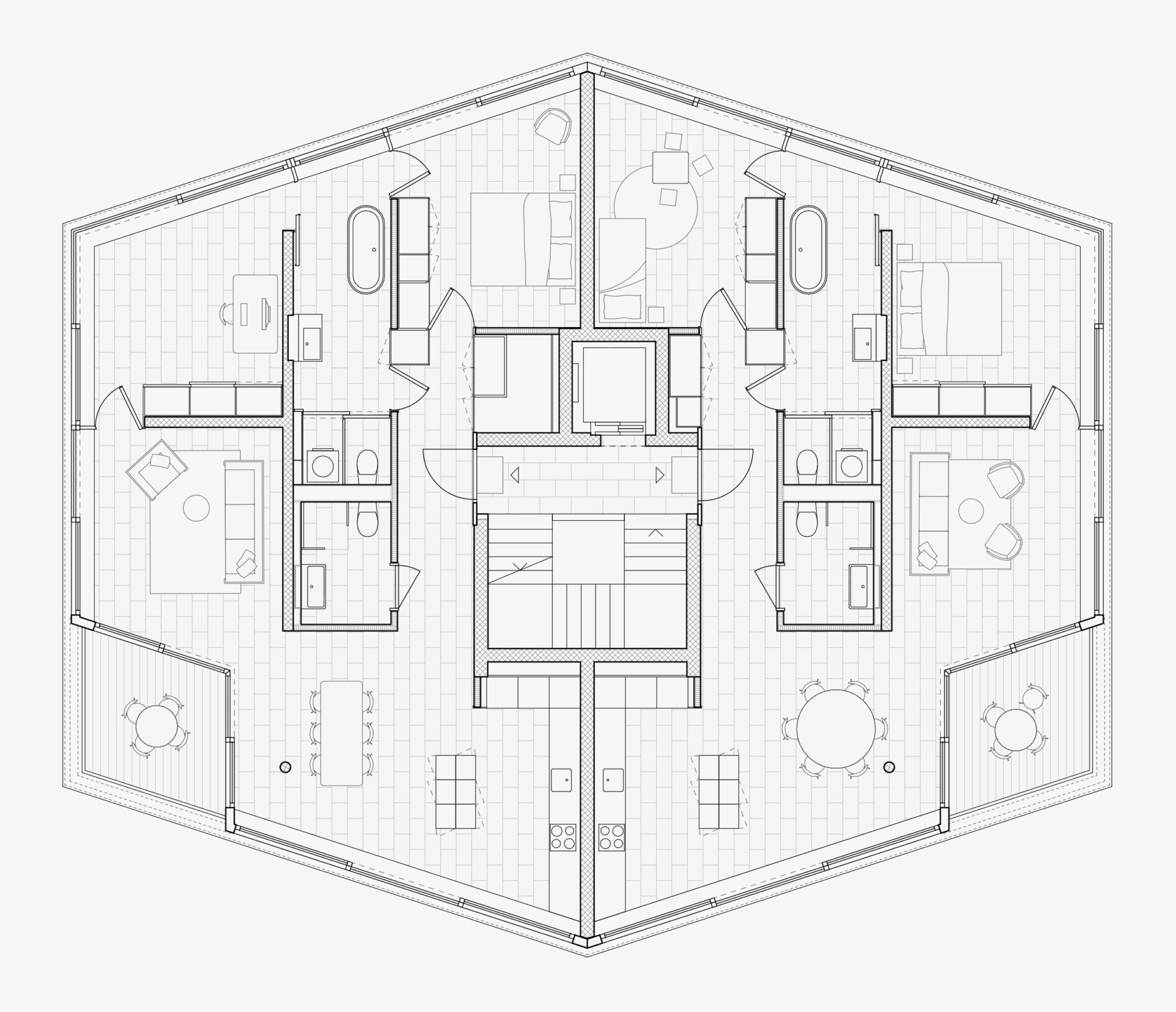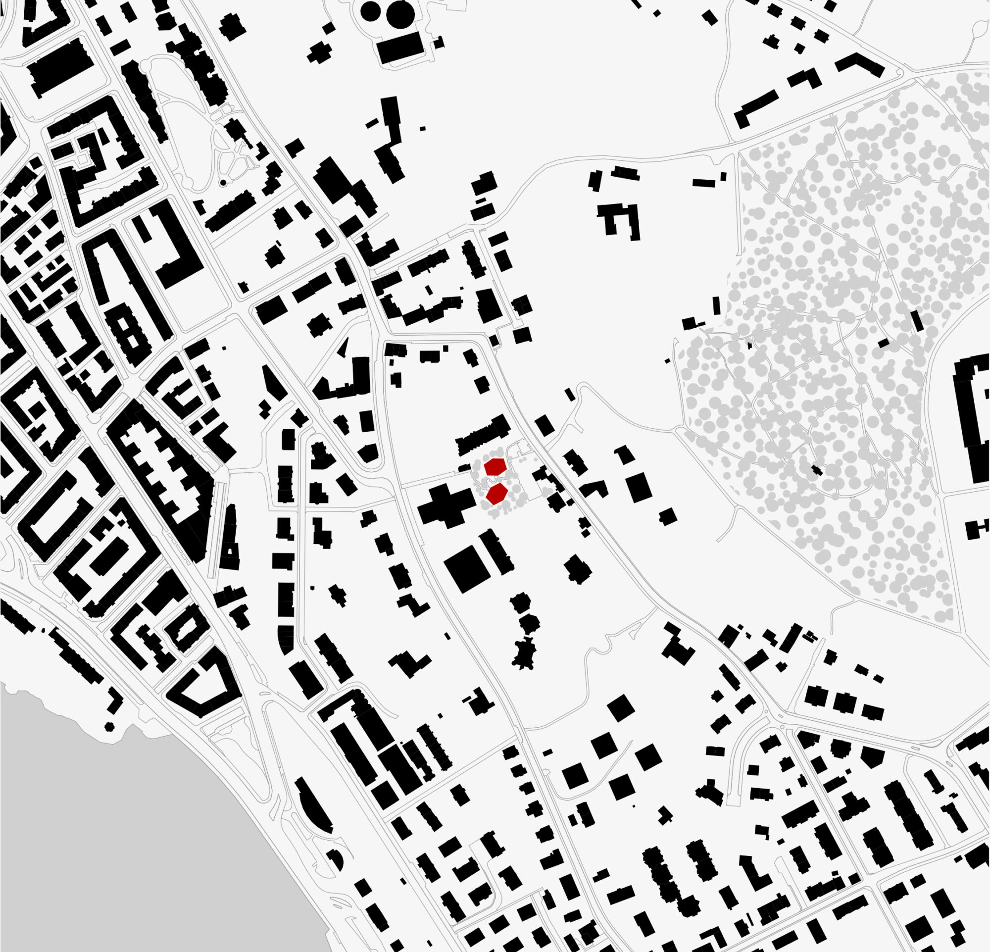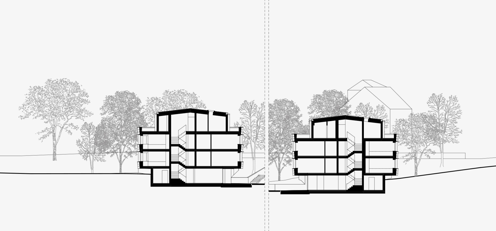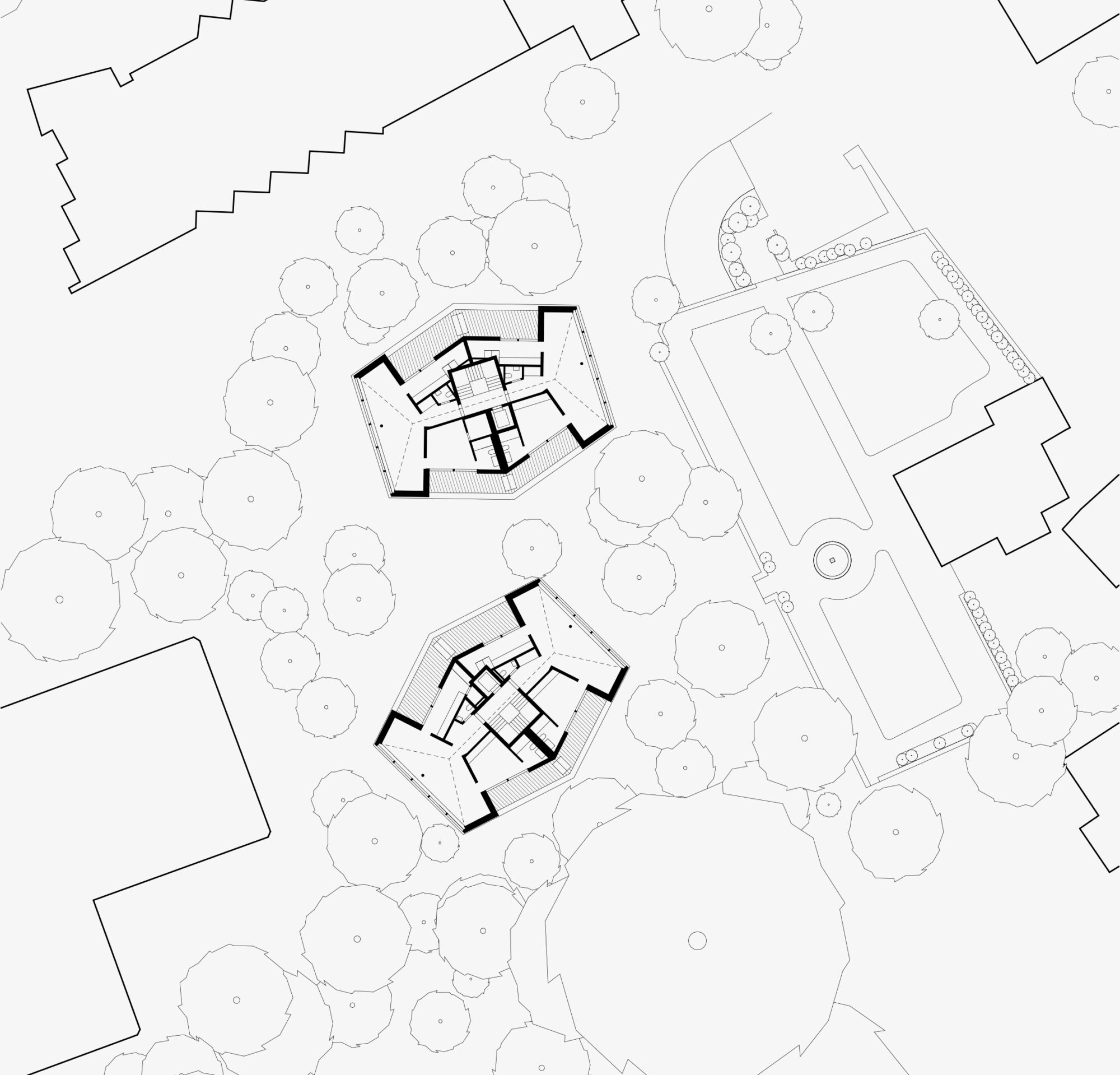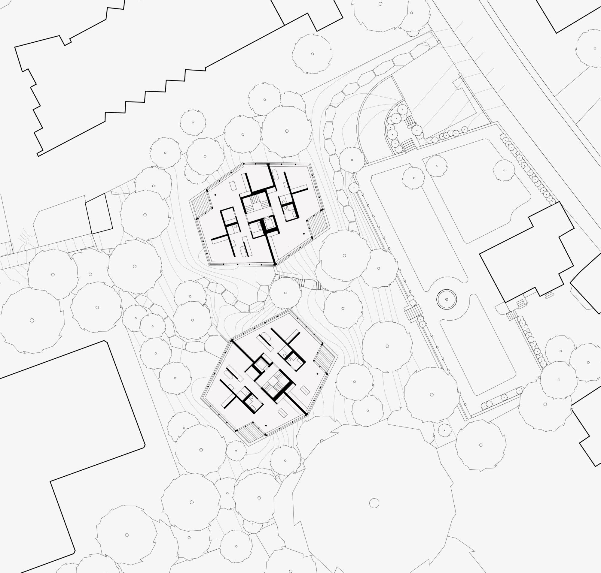 Die weiten Gärten und die dichte Nachbarschaft: diese Pole prägen die Konzeption zweier Wohnhäuser, die in einem der letzten freien Gärten entstehen sollen. Die neuen Gebäude sind weit von den alten abgerückt und als leichte Pavillons artikuliert. Sie stehen quer zum Hang auf rhombischer Grundfläche, um dem Hangverlauf wenig Widerstand entgegenzusetzen und weite Zwischenräume freizuhalten.
