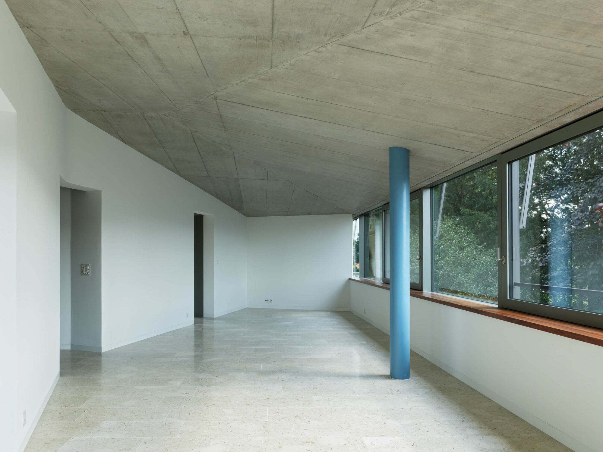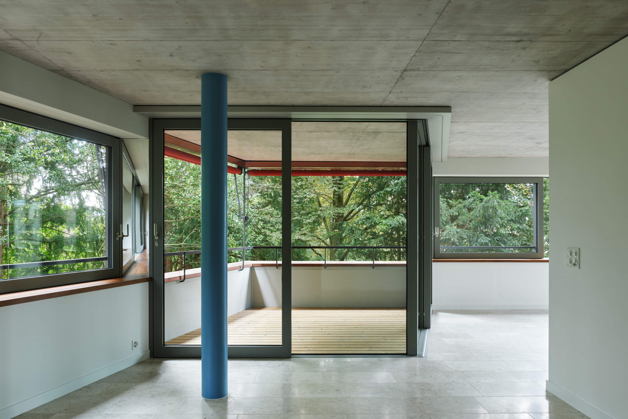 Nicht die Sicht auf den fernen See, sondern der Blick in die nahen Bäume machen den besonderen Reiz dieses Ortes aus. Ein umlaufendes Bandfenster öffnet deshalb alle Wohnräume zum Garten – ohne dass die Bewohner im Schaufenster wohnen müssten, denn Brüstung und Sturz geben den Räumen Halt und ihren Bewohnern Schutz.