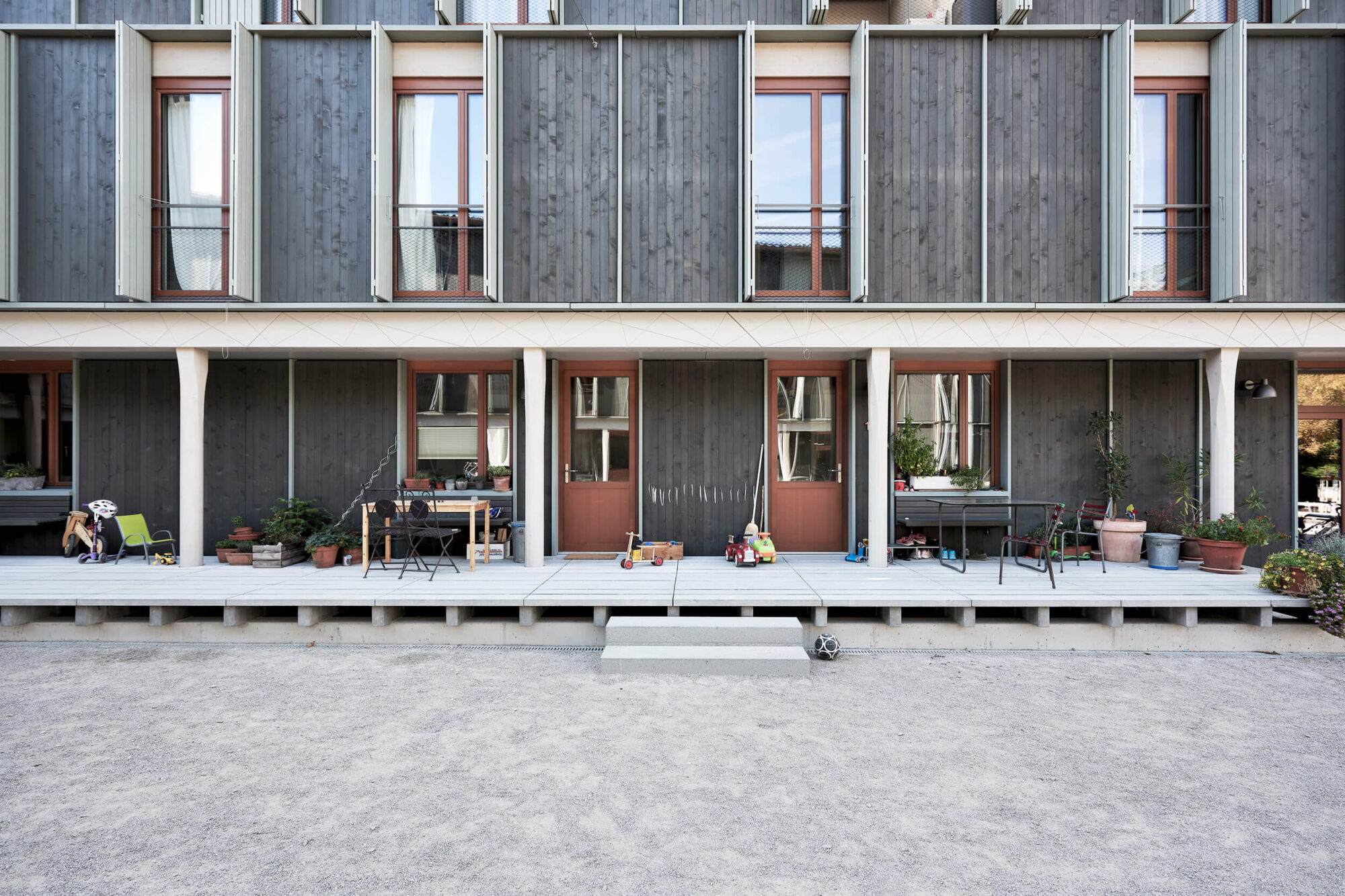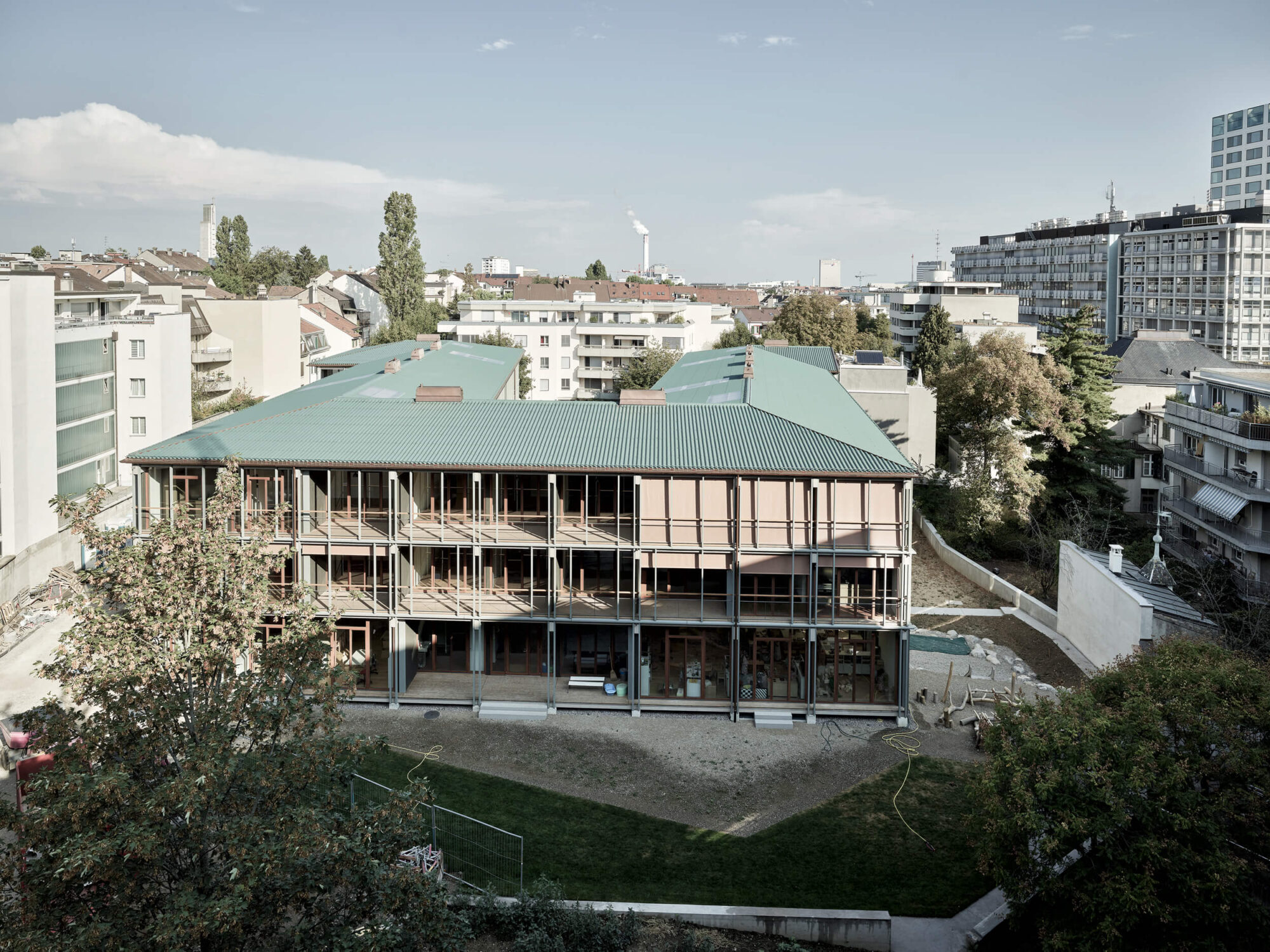 In den Höfen der Basler Innenstadt haben sich allmählich immer mehr Einbauten breitgemacht. Garagen, Werkstätten und Schuppen, die den Hofraum verdrängten, werden nun vielerorts entfernt. Dabei gehen allerdings auch lebendige Soziotope verloren. Wohnen und Arbeiten waren hier genauso wenig voneinander geschieden wie die privaten Territorien zwischen Nachbarn. Dieser Geist des Gewerbehofs von gestern lässt sich nicht einfach in den Wohnhof von morgen kopieren, aber übersetzen. Deshalb spricht das neue Haus die Sprache der früheren transitorischen Hofeinbauten. Leicht und niedrig steht es im Hof, aus Holz gefügt wie schon die gewerblichen Vorgängerbauten. Fast möchte man meinen, es sei provisorisch hier, wäre da nicht die entschiedene städtebauliche Setzung.