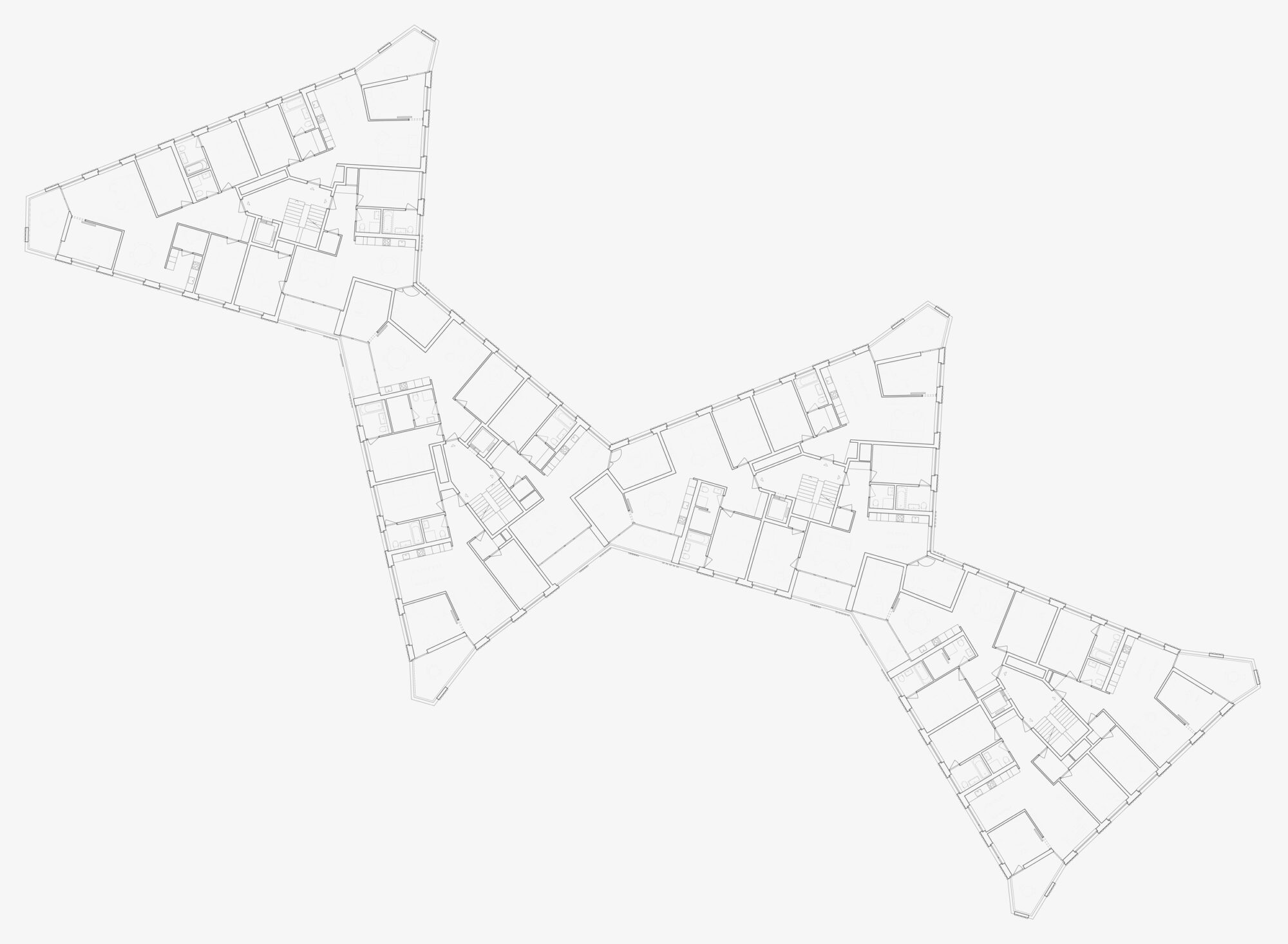In den Wohngeschossen darüber wird an diesen „Taillen“ im Baukörper die Zweiseitigkeit des Ortes besonders anschaulich erlebbar. Typologisch ist das Gebäude aus vier dreieckigen Segmenten gefügt, die dreispännig organisiert sind. Die plastische Abwicklung sorgt dafür, dass jede Wohnung auf zwei oder gar drei Seiten hin ausgerichtet ist. Während die beiden Wohnungen in den Übergängen zwischen den Segmenten komplementär ineinander greifen, ‚greift’ die dritte, äusserste Wohnung weit hinaus ins Freie.